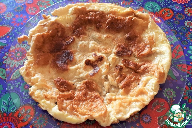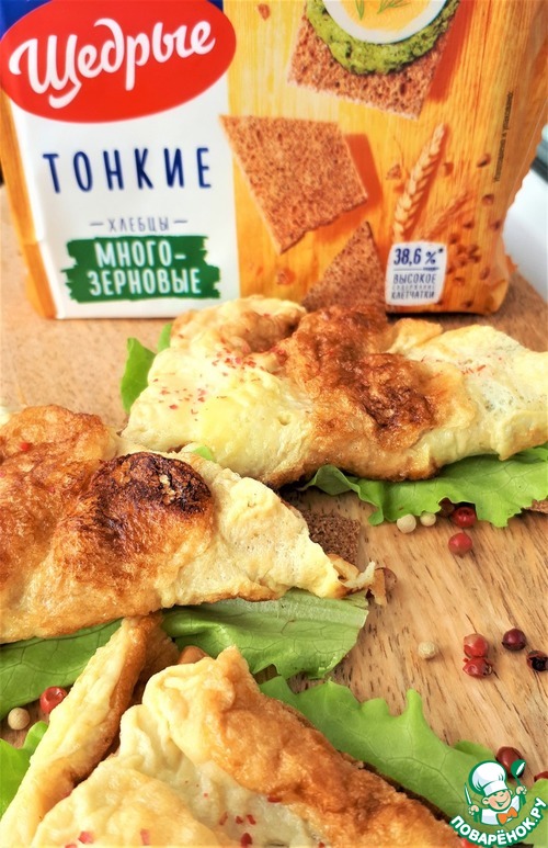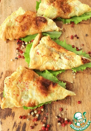 Яичницу обжарить на сковороде с двух сторон. Разрезать яичный блин на 4 части.