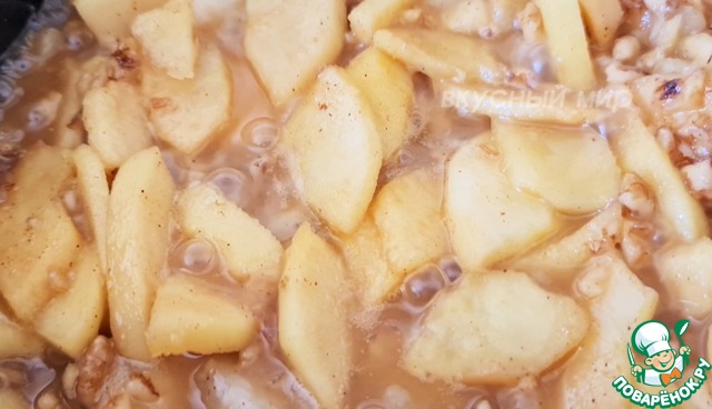 Приготовим начинку. Яблоки и грушу очистить и нарезать на средние кусочки. На сковороде растопить масло, выложить орехи, сахар и хорошо перемешать (можно добавить панировочные сухари, но я не добавляла). Добавить яблоки и груши, перкмешать и обжарить 5 минут, пока яблоки станут чуть мягче. Начинку снять с огня и немного остудить.