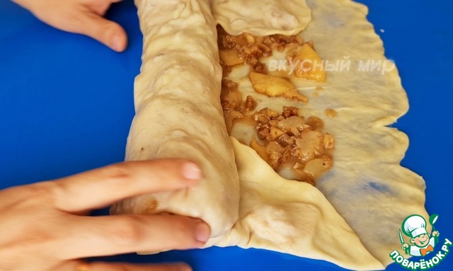 Распределить по всей поверхности начинку, оставив при этом все края свободными. Затем края завернуть вовнутрь. Теперь аккуратно завернуть штрудель рулетом и переложить на противень застеленный пергаментом.