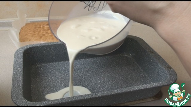 • Готовый горячий бисквит достаем с помощью пергамента из формы. Наливаем в форму 1/3 пропитки. Верх пирога наколем вилкой, это у нас будет низ.