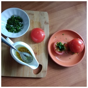 Берём тарелку, выкладываем дольку помидора, ложкой чайной поливаем её заправкой и присыпаем зеленью, накрываем второй долькой. Повторяем слой. У одного помидора будет 3 слоя заправки и зелени. Накрываем крышкой и даём промариноваться минут 20. В принципе, это уже готовая закуска без всяких дополнений, которую оценят все. Готовьте её больше! Она съестся очень быстро!