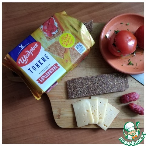 Для канапе я выбрала хлебцы бородинские ТМ Щедрые. Разрезала каждый хлебец пополам. По величине половинки хлебца нарезала ломтиками сыр.