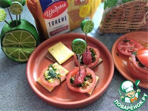 Канапе на бородинских хлебцах с быстрыми маринованными помидорами, сыром и пиколини.