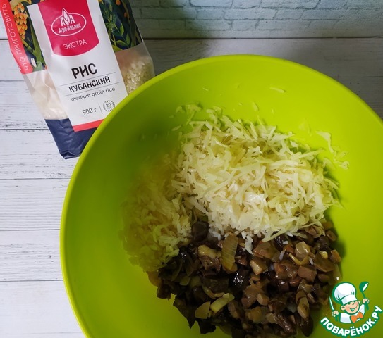 Капусту хорошо отжать от воды, смешать с грибами и рисом. Посолить, добавить специи и хорошо вымешать. -