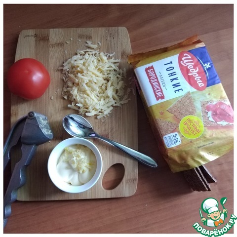Намазываем хлебцы майонезом с чесноком, поверх выкладываем сыр натёртый ваш любимый и на сыр выкладываем дольки порезанного помидора.
