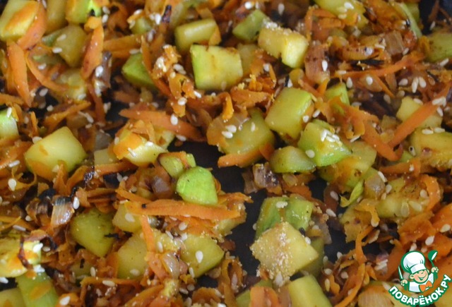 Обжарить лук в течений 2 минут, затем морковь 2 минуты, добавить кабачок и готовить до готовности 12-15 мину.