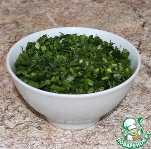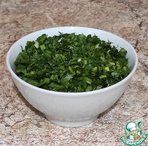 Зелёный лук, укроп, кинзу, петрушку чистим, моем, даём воде хорошо стечь. Затем мелко нарезаем.