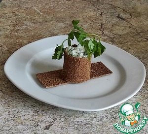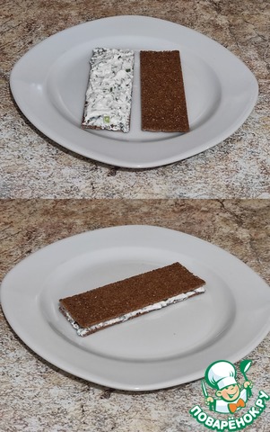 Часть хлебцев смазываем тонким слоем начинки и накрываем сухими хлебцами. Убираем под пленку в холодильник на 10 часов.