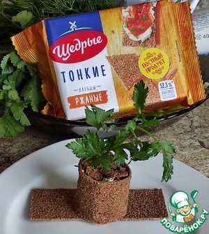 Далее разделяем хлебцы и "Сшиваем"из них "пеньки" стеблями зелени. Зубочистками