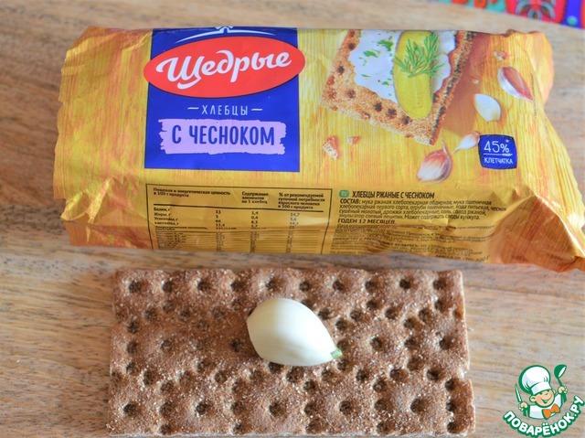 Берём чесночные хлебцы "Щедрые" и натираем их чесноком с двух сторон. Да, чесночные чесноком) Нам надо чтобы было "ух"!