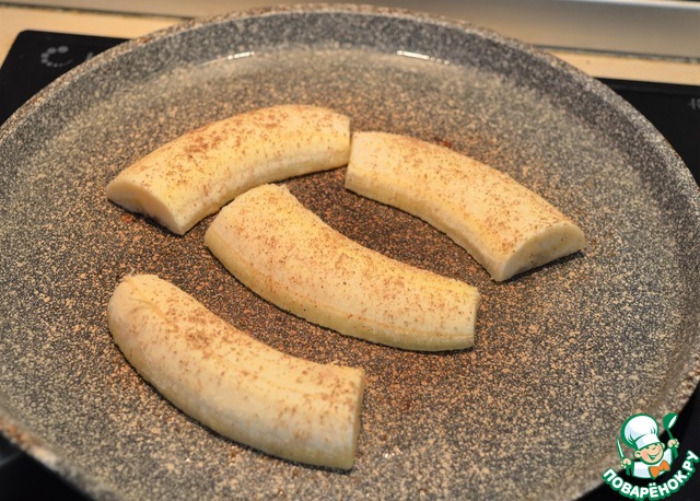 Банан разрезаем на 4 части. Вдоль и поперёк его! Обжариваем с двух сторон на растительном масле. Обе стороны перчим и солим по вкусу.