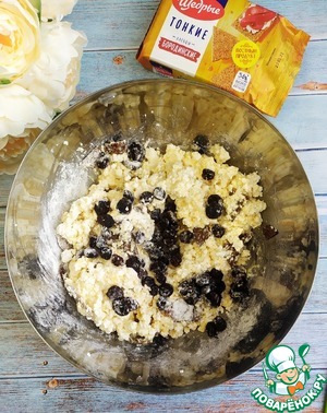 Далее, изюм промыть, обвалять в муке и добавить в чашу. Все хорошо перемешать.