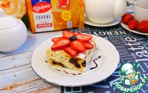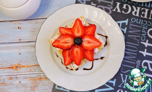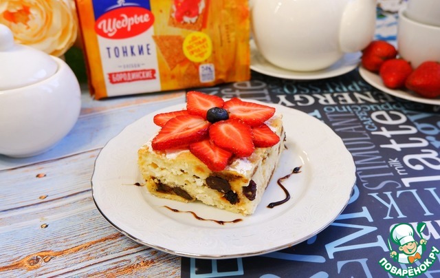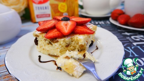 Готовую запеканку остудить, посыпать сахарной пудрой. Порезать на порции и украсить клубникой.