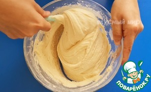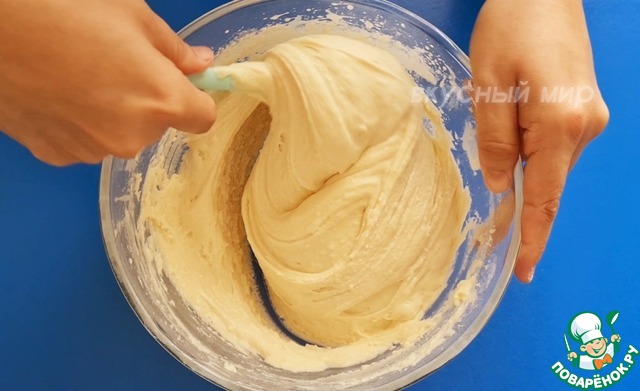 Всыпать просеянную муку. Очень нежно, аккуратно, движениями снизу вверх перемешать тесто лопаткой. Оно получится однородным, без комочков.