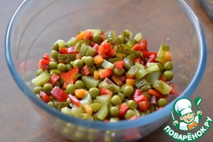к огурцам кусочки моркови и красного болгарского перца для красоты. Нарезать морковь и перец на кусочки. Добавить консервированный горошек. -