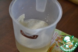 В мерный стакан налить 100мл. огуречного рассола, добавить 100мл. воды. Всыпать желатин, перемешать и оставить набухать. На медленном огне подогреть желатин до полного растворения. Оставить слегка остыть.