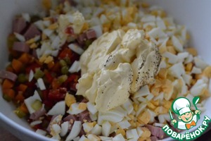 В отдельной миске смешать буженину, овощи, яйца. Добавить майонез, перец, соль. Влить желатин. Аккуратно перемешать.