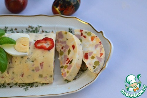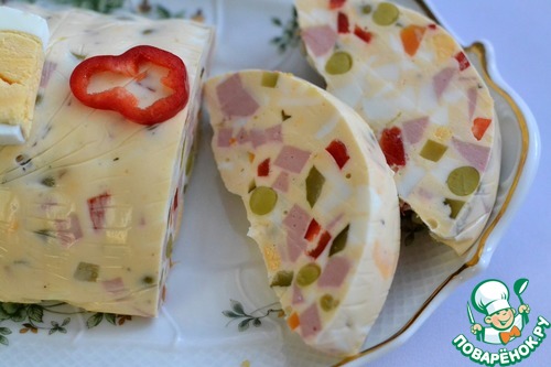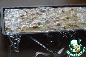 Вылить яичную массу в форму. Прикрыть пленкой со всех сторон. Поставить закуску в холодильник до полного застывания, желательно на ночь.