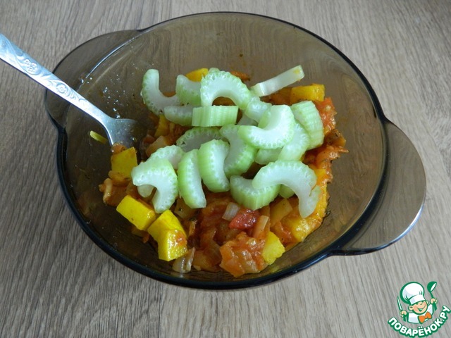 • Порезать стебель сельдерея. Его тушить не стала, люблю когда он похрустывает и так больше пользы для организма.