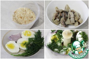 Сложить в чашу блендера сельдь, лук, укроп, яйца.