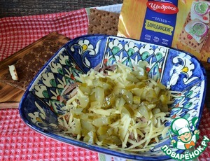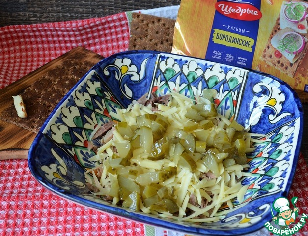 Маринованный огурец нарезать кубиком, добавить в салатник.