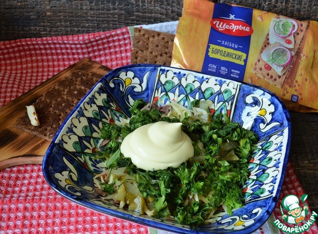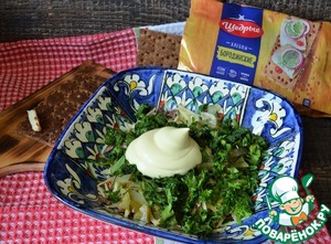 Зелень вымыть, просушить, мелко нарубить, добавить. Заправить майонезом.