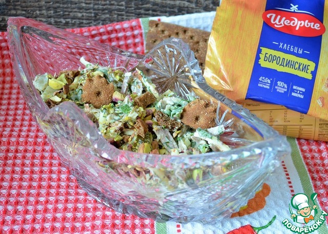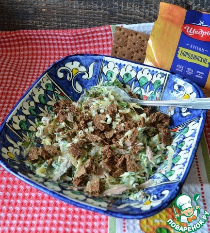 Пикантный салатик, с ядрёным ароматом чесночка, хрустящими хлебцами и курицей. Ох и хорош на закуску. Рекомендую.
