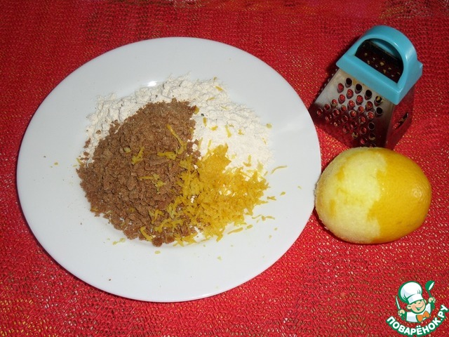 Готовим панировку - смешиваем муку, измельченные хлебцы и лимонную цедру.
