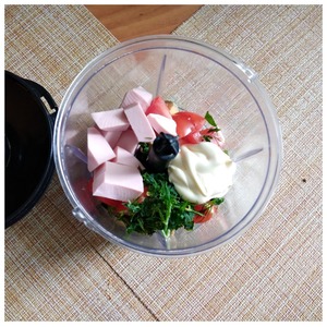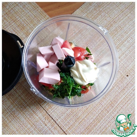 Яйца варим вкрутую. В чашу блендера помещаем порезанную колбасу, яйца, помидор. Помидор нужно брать для закуски мясистый или вынуть у него мякоть. Это для того, чтобы закуска не дала много сока и не получилась жидкой. Кладём порезанный чеснок, зелень, солим и перчим немного, кладём майонеза тоже вначале немного. Разбиваем.