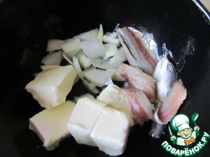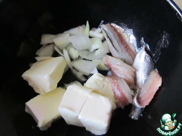 Сливочное масло заранее достать из холодильник, чтобы стало мягким. Лук порезать крупно.