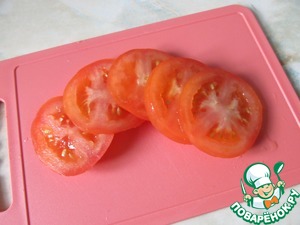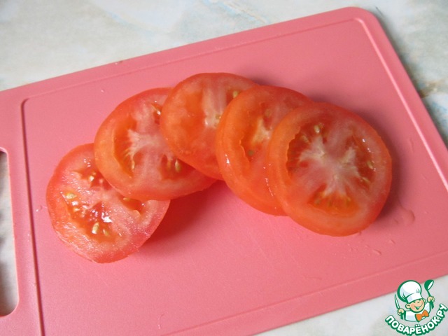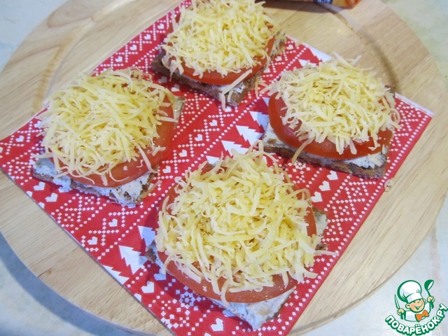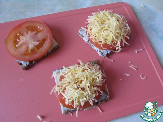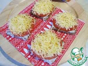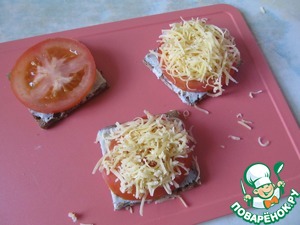 На каждый кусочек выложить кружок помидора и щедро посыпать сыром.