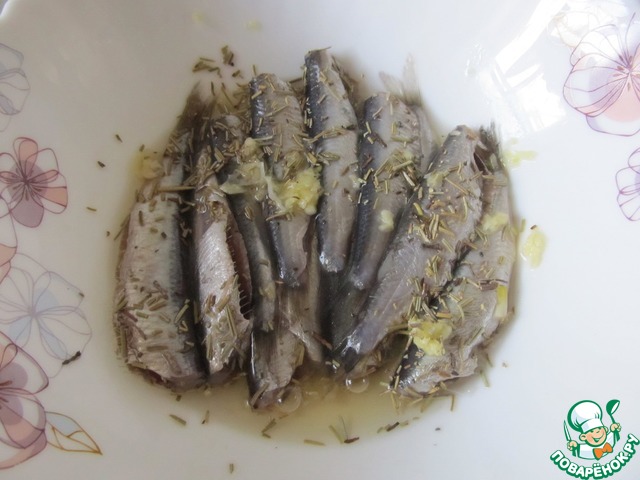 Поверх выложить по 2 кильки. Украсить зеленью.