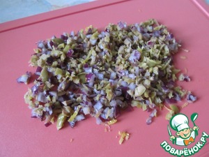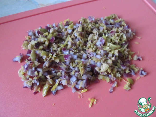 С половины лимона снять цедру. Оливки, лук и цедру выложить на разделочную доску и еще раз вместе мелко порубить.