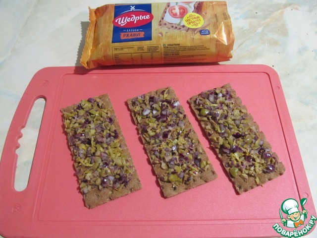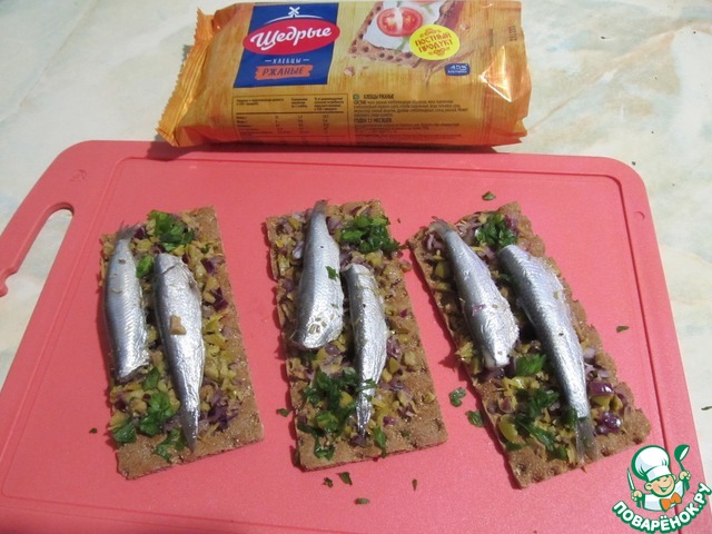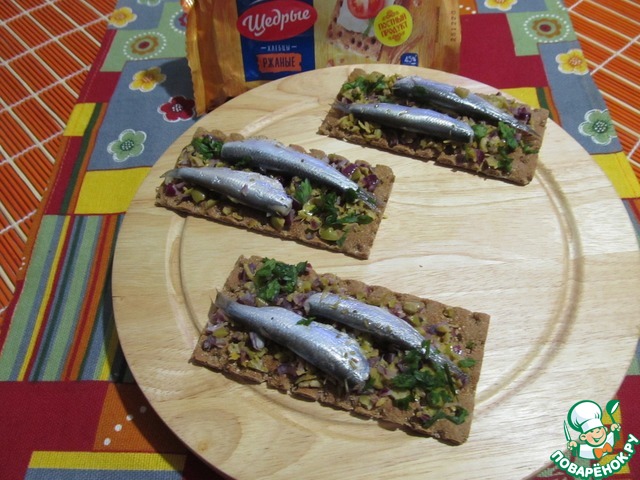 Рецепт «Хлебцы с килькой и оливками»: