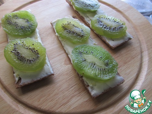 Хлебцы густо смазать сыром и выложить кружочки киви.
