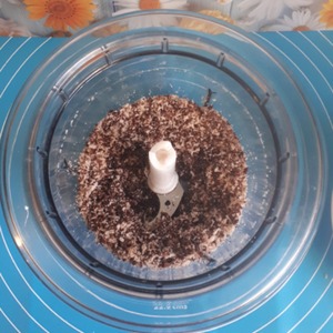 • В блендере измельчить кокосовую стружку, изюм и какао-порошок.