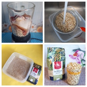 • Зеленую гречку 0,5 стакана промыть, замочить на ночь в воде, утром крупу промыть. В блендер загрузить зеленую гречку (замоченной получается 1 стакан), банан, какао-порошок, кокосовое молоко, сахар, вишню, ванилин.