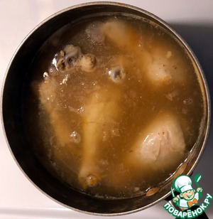 Варим курицу в соке квашенной капусты в течении 30 минут. Образовавшуюся пенку при закипании необходимо удалить. Если берете более крупную кастрюлю, то, возможно сока понадобится больше. Главное, чтобы мясо было полностью покрыто жидкостью (при необходимости можно добавить больше сока или воды). Мне хватило 450 мл сока, который полностью покрыл мясо.