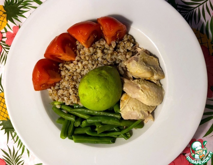 Курочка варится в соке квашеной капусты, затем гречка варится в этом бульоне, насыщаясь полезными макро- и микроэлементами капусты и моркови. Отварная зеленая фасоль обогащает это блюдо клетчаткой и другими полезными элементами. Если будете использовать постное мясо для этого блюда, то в качестве полезных жиров здесь хорошо подходит авокадо. Помидоры хорошо увлажняют гречку, делая это блюдо не только еще более полезным, но и очень вкусным.