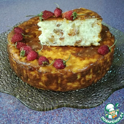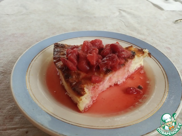 Готовой запеканке даём немного остыть. Разрезаем на кусочки, по желанию посыпаем сахарной пудрой или поливаем сметаной. У меня клубничный сироп. Приятного аппетита!