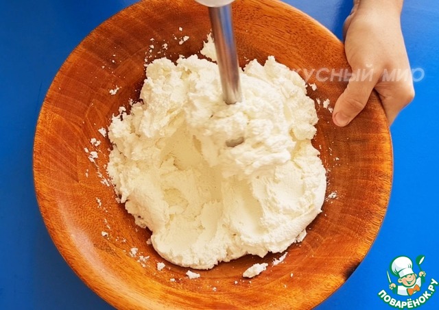 В объемную миску кладем творог, щепотку соли и пробиваем погружным блендером, чтобы получилась гладкая и однородная творожная масса. Если у вас нет погружного блендера, используйте стационарный с чашей или протрите творог через сито, а затем все тщательно перемешайте миксером, венчиком или вилкой.