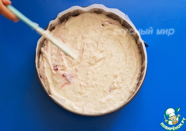 По желанию можно добавить изюм, цукаты или оставить запеканку с ванильным вкусом. Форму для запекания смазываем маслом или застелить пергаментом, (форма 20см). Выкладываем творожную смесь в форму, разравниваем.