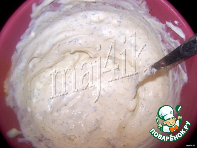 - Соус (майонез, сметана и сливочный сыр с зеленью типа Филадельфии - всё в соотношении 1:1)