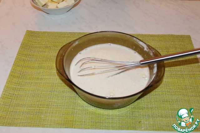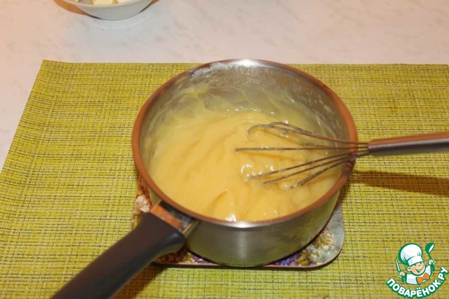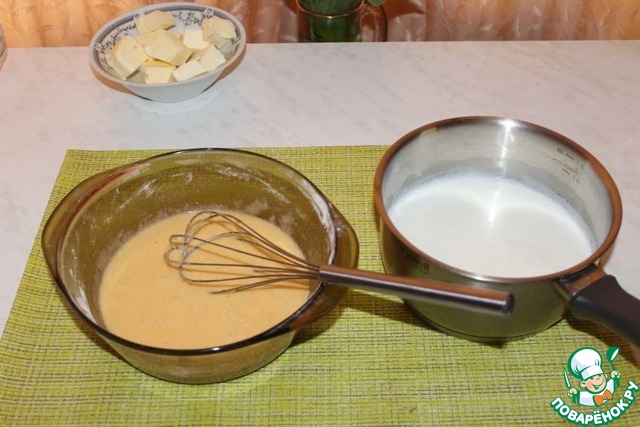 Постепенно добавляем горячее молоко в яично-сахарную смесь. Хорошо перемешиваем.