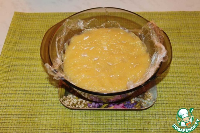 Перекладываем в чашку, накрываем пищевой плёнкой в контакт. Полностью остужаем.