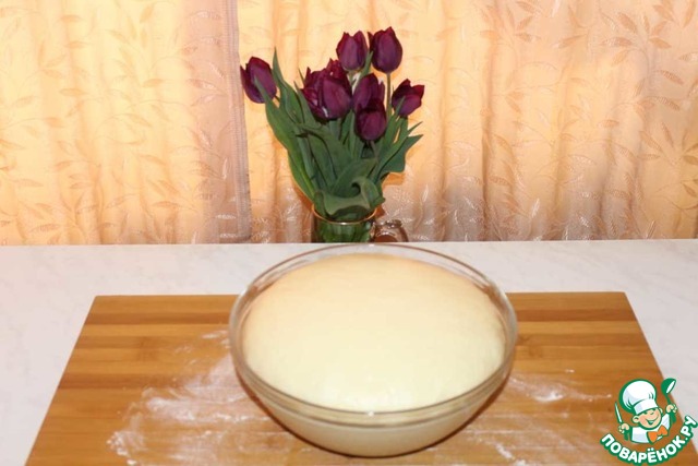 Замешиваем гладкое, мягкое и однородное тесто. Прикрываем пищевой плёнкой и оставляем на подъем на 1 час.