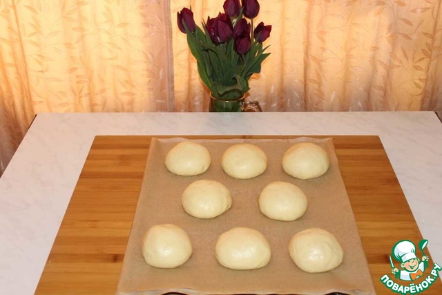 Немного обминаем тесто. Делим на 8 равных частей. Подкатываем каждый кусочек. Прикрываем пищевой плёнкой и оставляем подходить 30 минут.