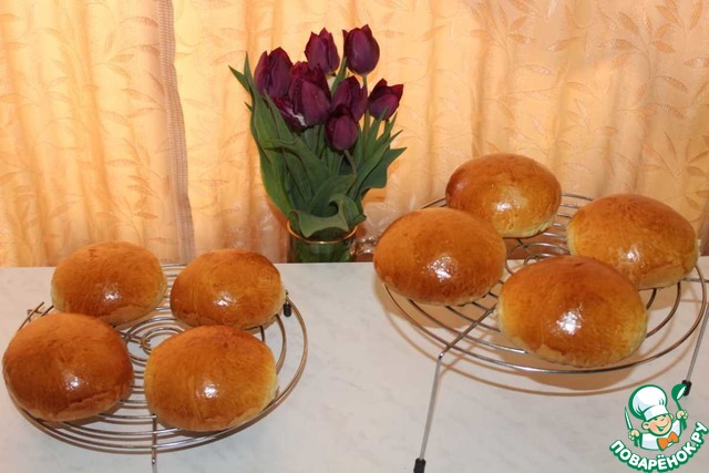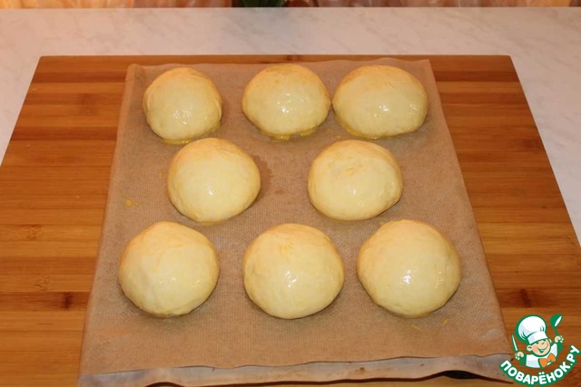 Подошедшие булочки смазываем желтком разбавленным 1 ст л молока.