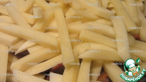 • К мясу добавить нарезанный картофель и кипяченую горячую воду (бульон), вода должна покрывать картофель. Режим - тушение 30 мин.