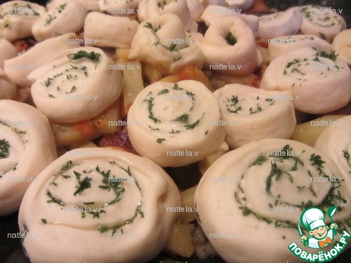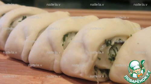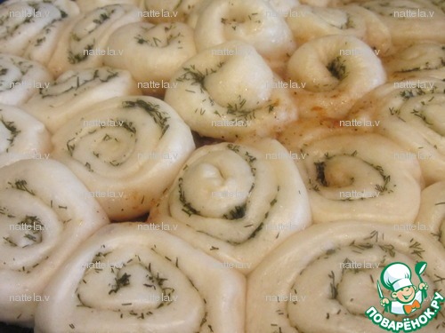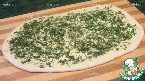 • Далее раскатать тесто в овал (толщина 3-4 мм.), смазать сливочным маслом, сверху посыпать мелко нарезанной зеленью и скрутить рулет.